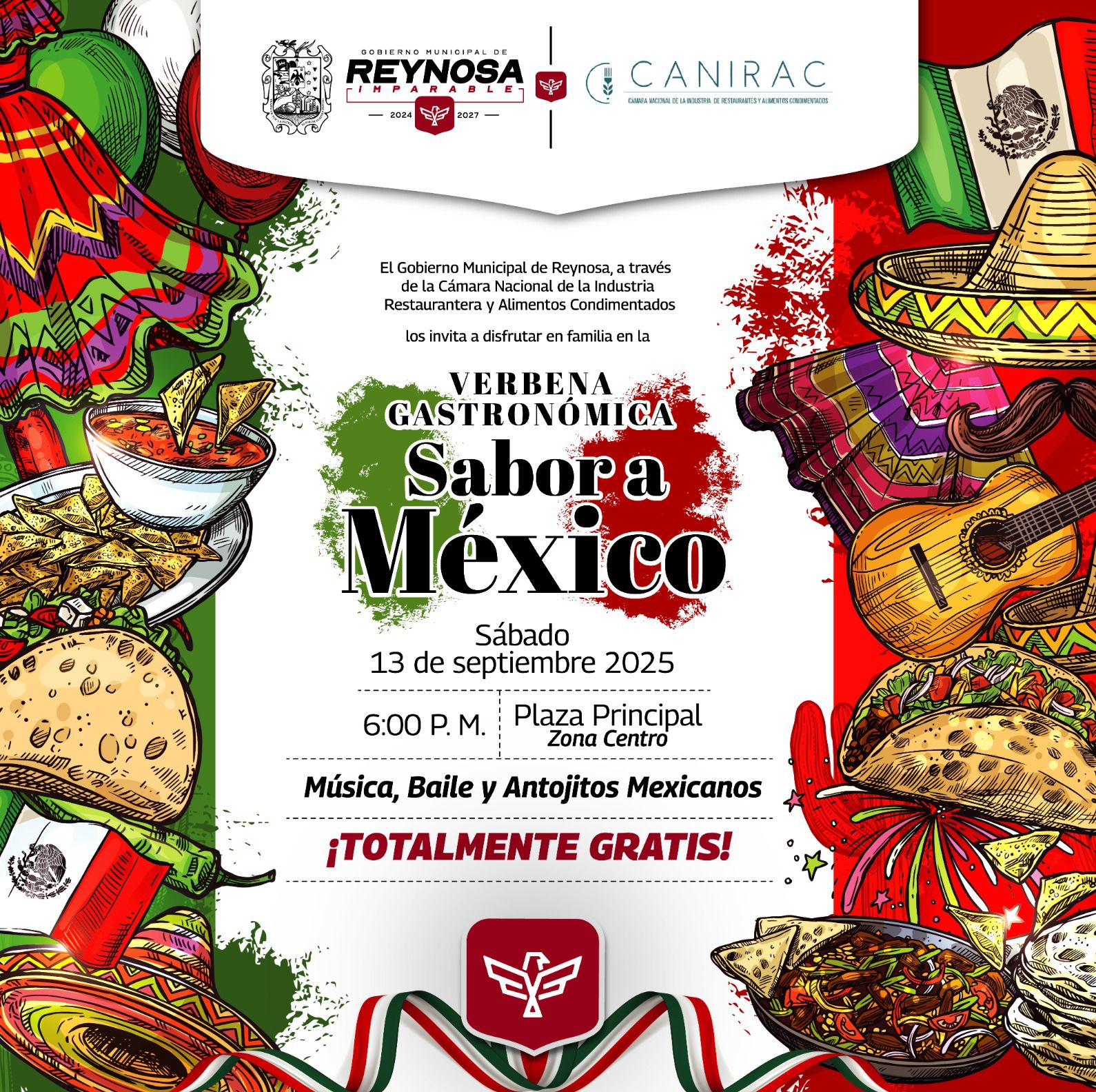 Hoy 13 de septiembre disfruta del Sabor a México, una gran verbena gastronómica organizada por el Presidente Municipal Carlos Peña Ortiz, quien a través del Gobierno de Reynosa y de la Cámara Nacional de la Industria Restaurantera y Alimentos Condimentados para que la disfrutes en familia.