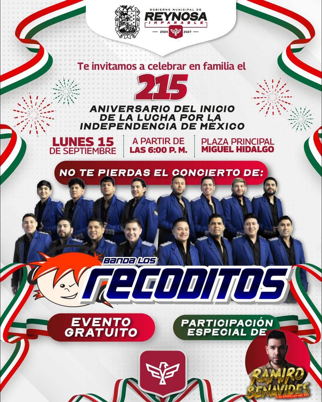 El Presidente Municipal Carlos Peña Ortiz invita a la población a conmemorar el 215 Aniversario del Inicio de la Lucha por la Independencia de México y disfrutar la música de la Banda Los Recoditos, este 15 de septiembre en la plaza principal Miguel Hidalgo a partir de las 6:00 de la tarde.
