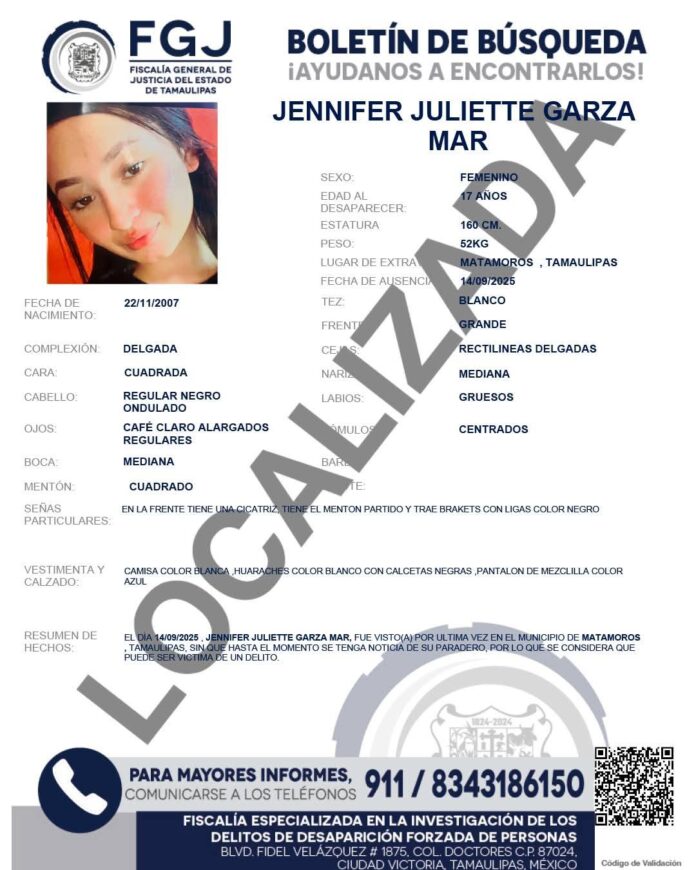 La Comisión Estatal de Búsqueda de Personas de Tamaulipas informó que Jennifer Juliette Garza Mar, de 17 años, fue localizada con vida luego de haber sido reportada como desaparecida el pasado 14 de septiembre en Matamoros.