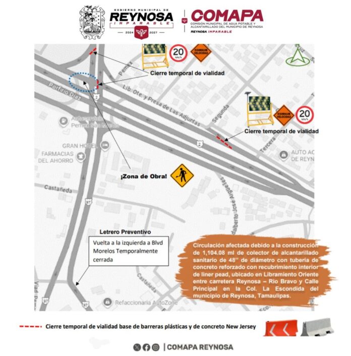 A partir de este martes 23 de septiembre, personal del organismo realizará maniobras sobre el Libramiento Oriente, entre la carretera Reynosa–Río Bravo y la calle Principal, en la colonia La Escondida, con el objetivo de mejorar y fortalecer la red sanitaria de la zona, garantizando un servicio más eficiente para miles de usuarios.