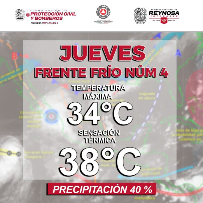 La Coordinación de Protección Civil y Bomberos de Reynosa informa que, el frente frío número 4 permanecerá como estacionario sobre el Norte y Noreste del país, en interacción con un canal de baja presión, lo que causará lluvias de moderadas a intensas en la zona fronteriza.