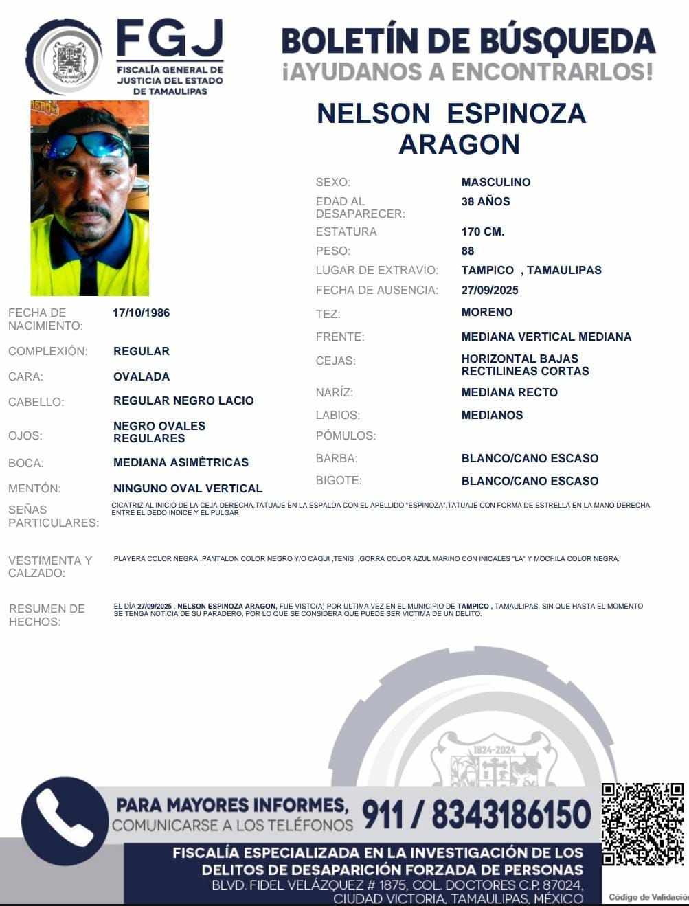 La Fiscalía Especializada en Personas Desaparecidas de Tamaulipas informó sobre la desaparición de Nelson Espinoza Aragón, de 38 años, visto por última vez en el municipio de Tampico el pasado 27 de septiembre de 2025. Hasta el momento, se desconoce su paradero y las autoridades consideran que podría ser víctima de un delito.