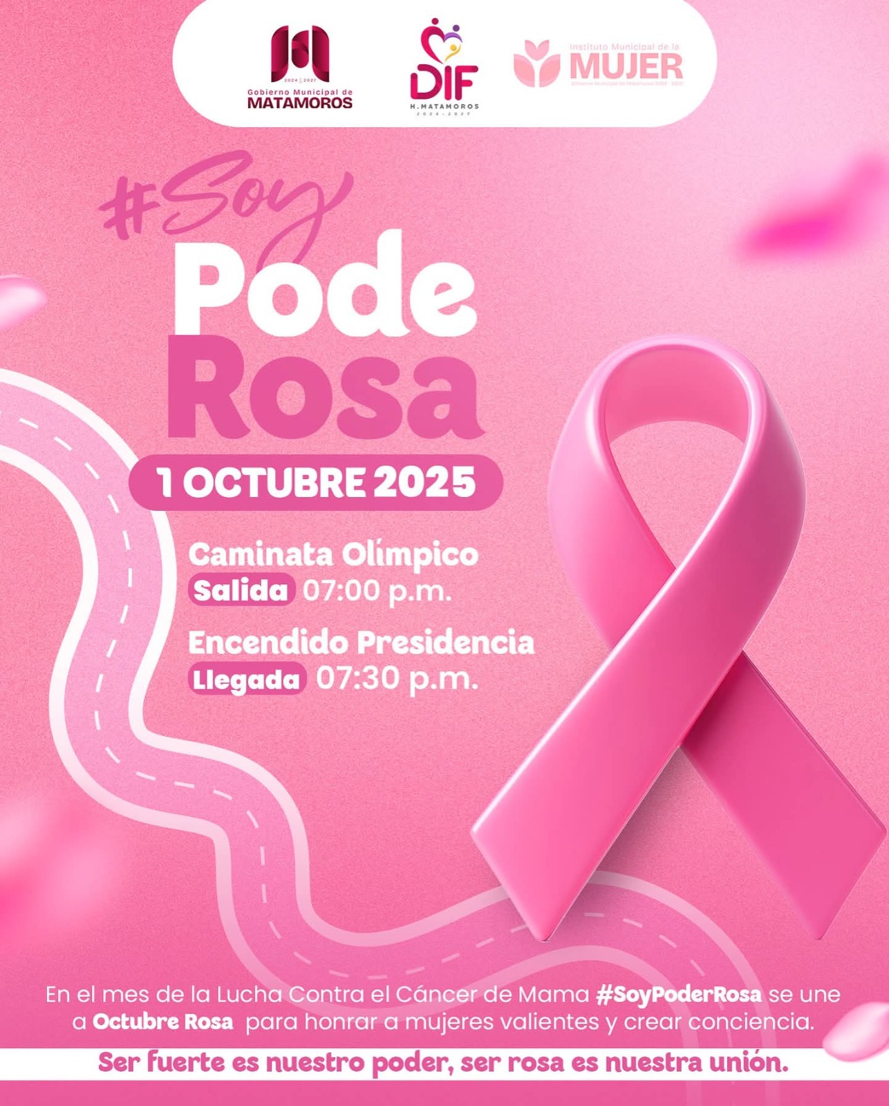 El Sistema DIF Matamoros, presidido por Ana Ariceaga de Granados, convocó a la ciudadanía a sumarse a la caminata “Soy PodeRosa”, una actividad emblemática en el marco del Mes de la Lucha Contra el Cáncer de Mama. La cita es el próximo 1 de octubre a las 19:00 horas en el Parque Olímpico, con la meta de reforzar la conciencia sobre la detección temprana y brindar un homenaje a quienes enfrentan o han enfrentado esta enfermedad.