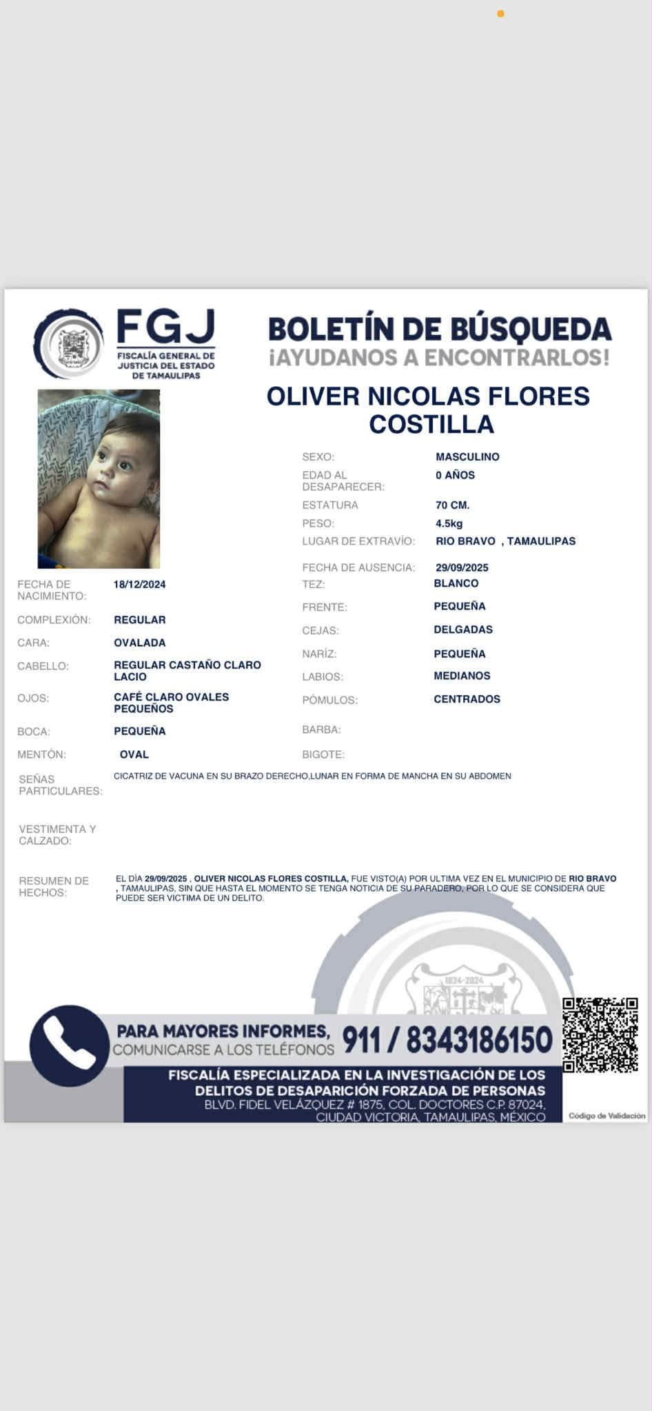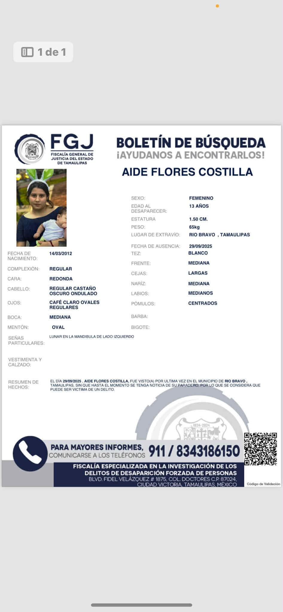 La Fiscalía General de Justicia del Estado de Tamaulipas emitió un boletín de búsqueda para localizar a Aide Flores Costilla, de 13 años, y Oliver Nicolás Flores Costilla, de 9 meses, quienes desaparecieron el pasado 29 de septiembre en el municipio de Río Bravo.