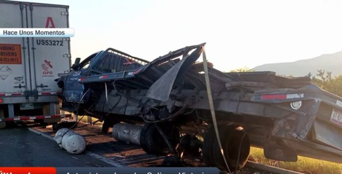 El percance ocurrió cuando el conductor de una camioneta de plataforma se impactó contra un tráiler que circulaba hacia Nuevo Laredo. Tras el fuerte choque, la pesada unidad se proyectó contra el barandal de protección y sufrió daños de consideración.