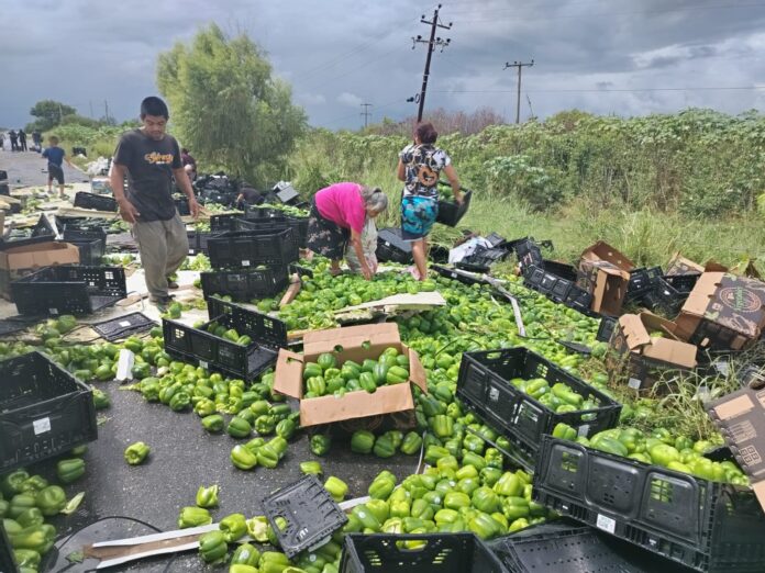 De acuerdo con los primeros reportes, el conductor perdió el control de la pesada unidad mientras circulaba en sentido de sur a norte, lo que provocó que la caja se desplomara y terminara volcada sobre el asfalto. La carga de vegetales quedó esparcida en el pavimento, generando un cierre parcial de la vía.
