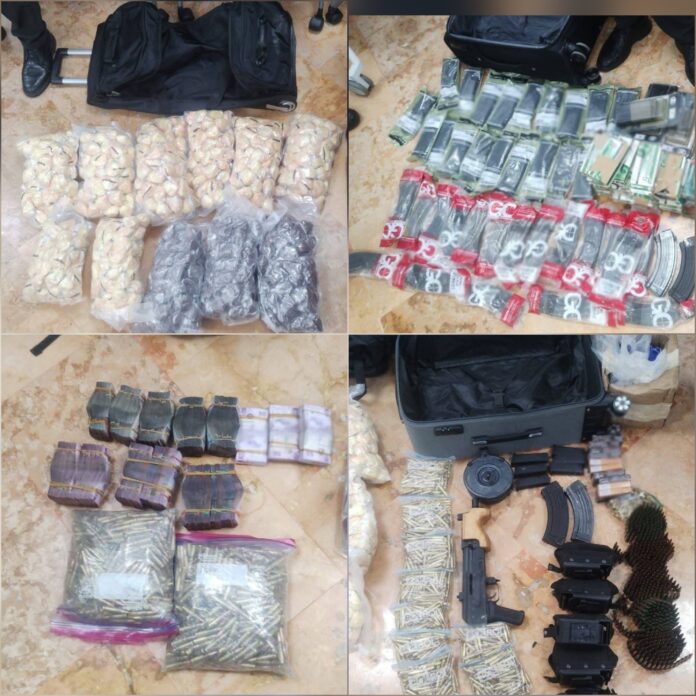 De acuerdo con reportes preliminares, durante una inspección rutinaria en el área de aterrizaje, el personal federal tuvo contacto con tres pasajeros del vuelo, quienes mostraron actitud sospechosa al ser abordados por las autoridades. Tras revisar la aeronave, se localizaron diversos paquetes con sustancias ilícitas y armas de fuego de uso exclusivo del Ejército.