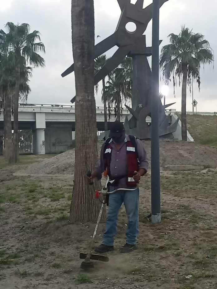 Mantenimiento en Monumento Reynosa con realizaron trabajo de corte de maleza, limpieza general, barrido y raspado de banquetas y cordones en el monumento de la carretera Monterrey-Reynosa.
