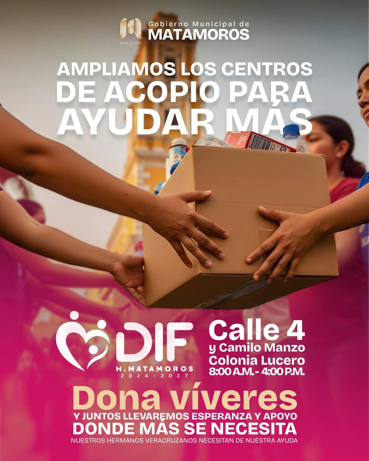 El DIF Matamoros invita a toda la población a acudir durante el horario laboral a sus instalaciones para hacer su aportación. Cada donativo representa una muestra de empatía y compromiso con las familias veracruzanas que hoy necesitan apoyo.