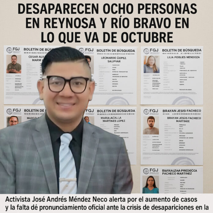 Ocho personas, incluido un menor de edad, han sido reportadas como desaparecidas en los municipios de Reynosa y Río Bravo durante las primeras semanas de octubre, de acuerdo con información oficial de la Fiscalía General de Justicia del Estado de Tamaulipas (FGJ) y declaraciones del activista y consejero honorífico del Sistema Nacional de Búsqueda de Personas, José Andrés Méndez Ñeco.