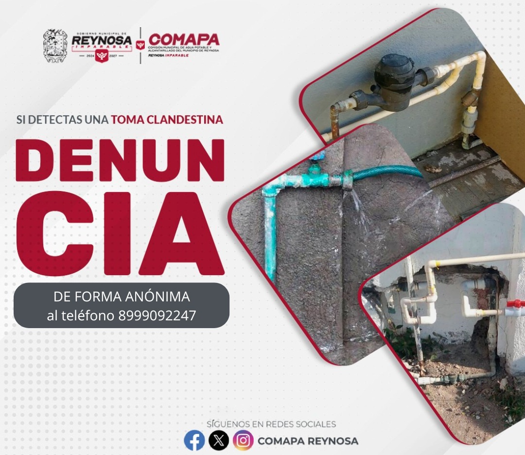 La Comisión Municipal de Agua Potable y Alcantarillado de Reynosa exhorta a la ciudadanía a denunciar cualquier toma clandestina que detecten en sus sectores, ya que este tipo de conexiones irregulares afectan directamente la presión y el suministro del vital líquido, provocando un servicio deficiente en distintas colonias.