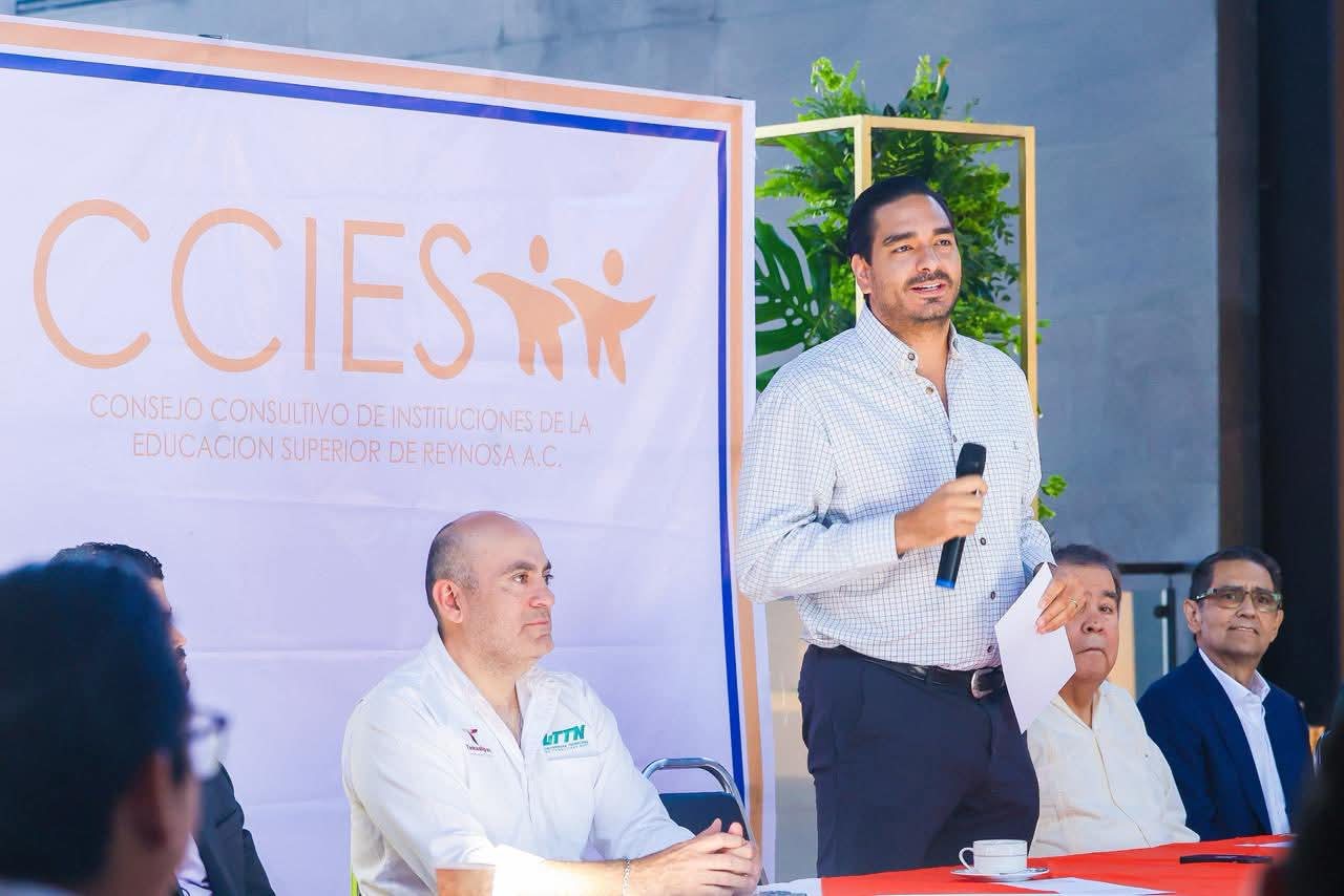 Como Presidente del Consejo, CCIES, el Doctor Oscar W. Aguilera, dio la bienvenida y apertura de la Sesión y junto al Alcalde y los Rectores, Directores y administrativos de Colegios y Universidades entregó el reconocimiento al gran visionario, impulsor de la educación en Reynosa, Mtro. Rosendo Martínez Gómez