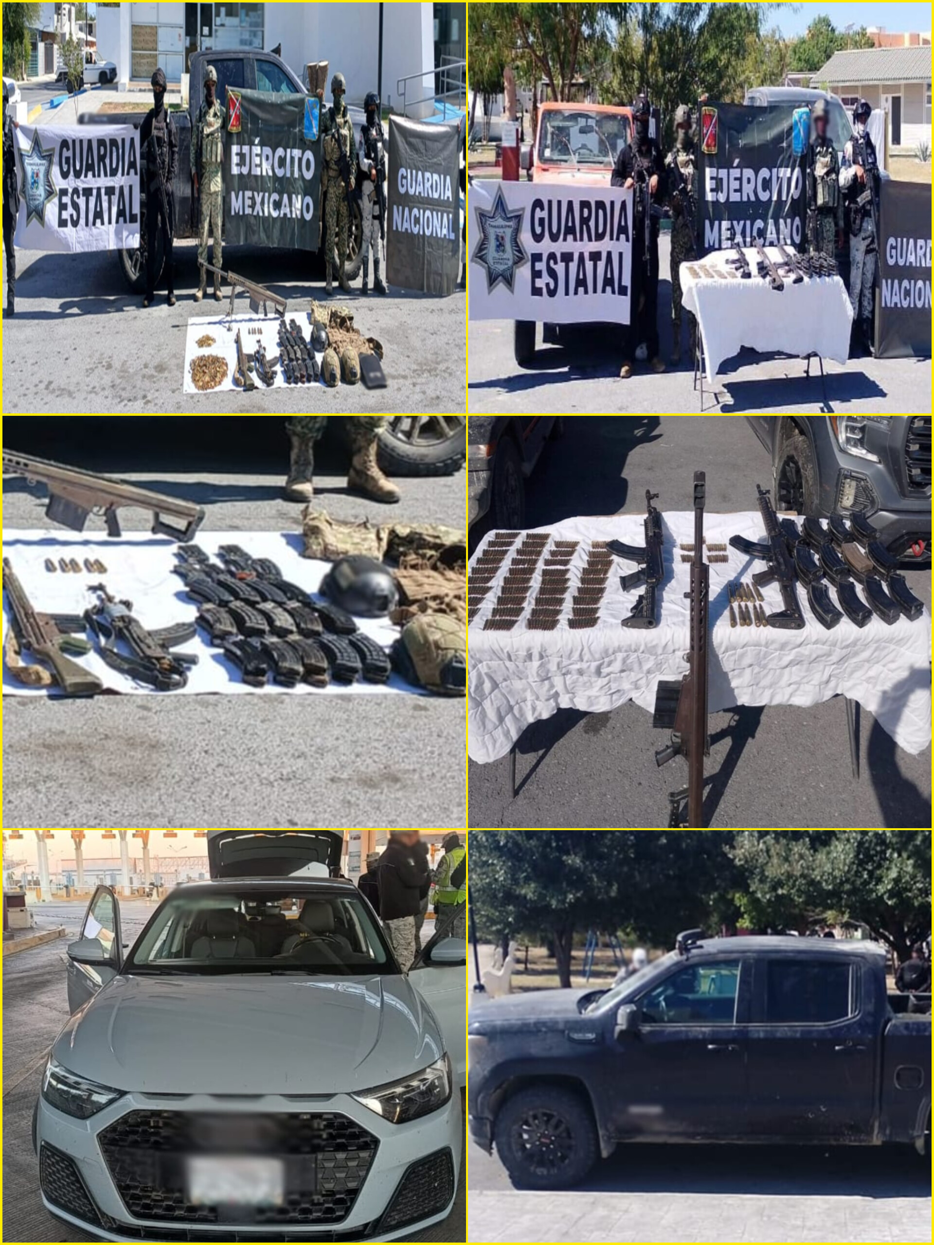 En el municipio de Camargo, los elementos localizaron dos vehículos con reporte de robo, un fusil Barrett, dos armas largas, 35 cargadores y 623 cartuchos. Mientras tanto, en Ciudad Mier se logró la liberación de una persona privada de la libertad, así como el aseguramiento de otro fusil Barrett, dos armas largas, 39 cargadores, 915 cartuchos, tres chalecos tácticos, dos placas balísticas y un vehículo con reporte de robo.