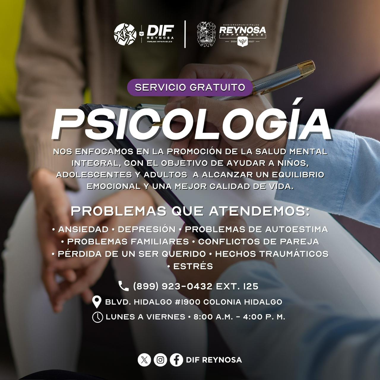 Con el compromiso de promover el bienestar integral de la población, el Sistema DIF-Reynosa, que preside Carlos Luis Peña Garza, invita a la ciudadanía a aprovechar el servicio gratuito de psicología, disponible en las instalaciones del DIF Central, ubicado en bulevar Hidalgo 1900, en la colonia Hidalgo.