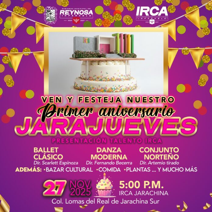 El Gobierno de Reynosa, que preside el Alcalde Carlos Peña Ortiz, invita al público a festejar el primer aniversario del Jarajueves, una iniciativa cultural que ha dado vida a las tardes del último jueves del mes en el Instituto Reynosense para la Cultura y las Artes sede Jarachina.