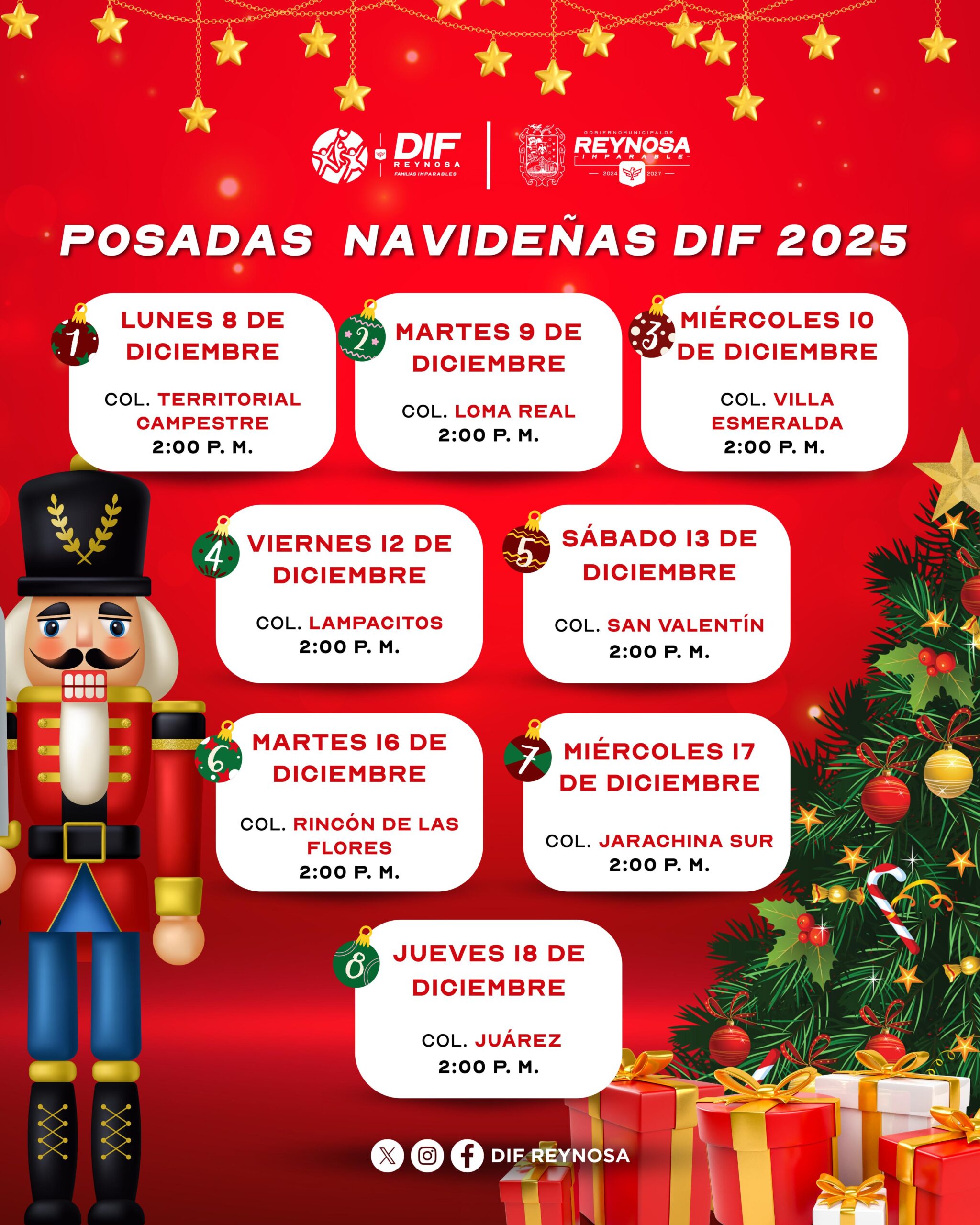 Las Posadas DIF se realizarán el lunes 8 de diciembre en la colonia Territorial Campestre; el martes 9 de diciembre en la colonia Loma Real; el miércoles 10 de diciembre en Villa Esmeralda; el viernes 12 de diciembre en colonia Lampacitos; el sábado 13 de diciembre en San Valentín; el martes 16 de diciembre en Rincón de las Flores; el miércoles 17 de diciembre en Jarachina Sur; y jueves 18 de diciembre en la colonia Benito Juárez.