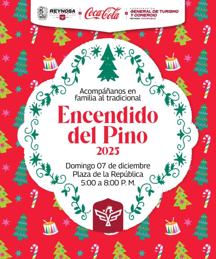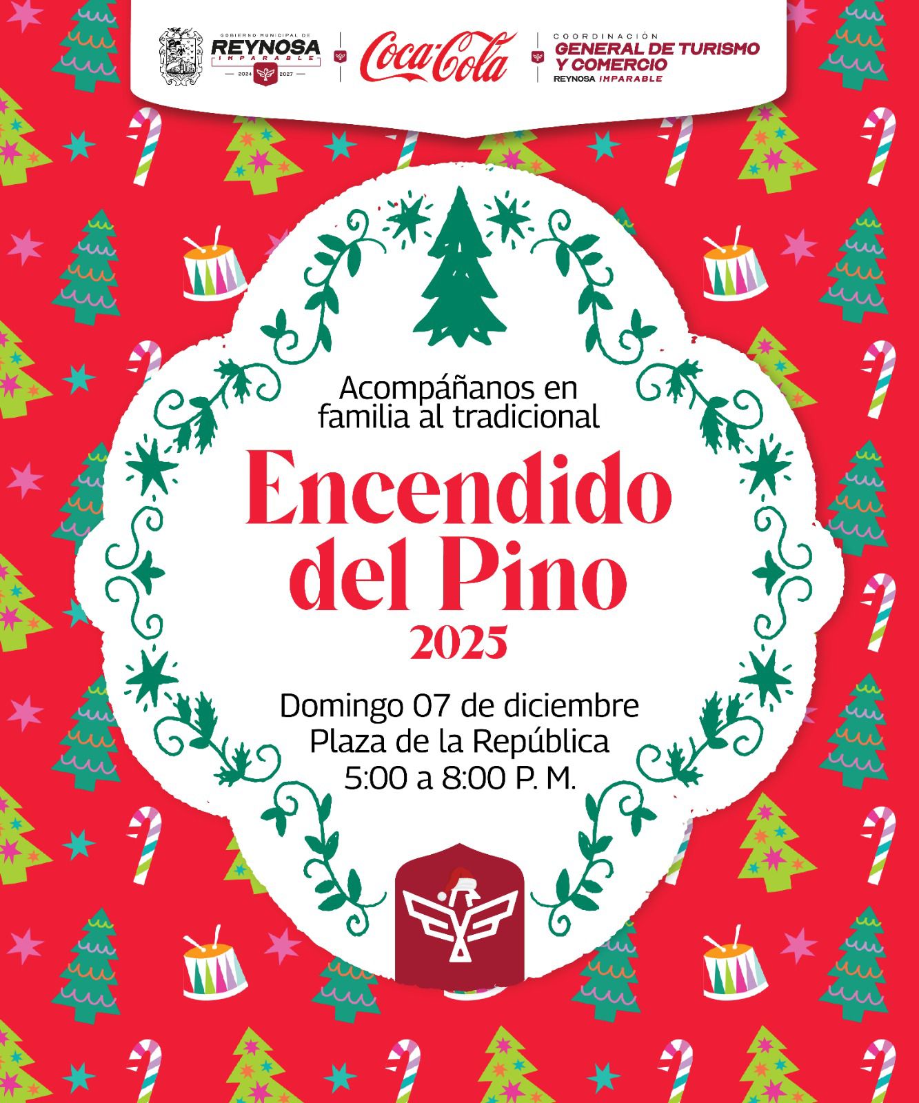 El Presidente Carlos Peña Ortiz invita a la familias de Reynosa al tradicional Encendido del Pino 2025, de la Plaza de la República, asiste hoy domingo 7 de diciembre a partir de las 5:00 de la tarde y disfruta de grandes sorpresas para chicos y grandes; el Pino de Arca Continental se ubica ahí, donde comienza la Patria, para recibir con espíritu navideño a los visitantes de nuestro país, vive hoy el colorido de la época con el Alcalde y las familias asistentes.