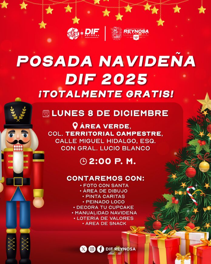 Alegría y esperanza llevará el Alcalde, Carlos Peña Ortiz, a través del Sistema DIF Reynosa que preside Carlos Luis Peña Garza, a las familias de la colonia Territorial Campestre y sectores aledaños, en la Posada Navideña DIF 2025, que se realizará este lunes 08 de diciembre a las 2:00 de la tarde en el área verde ubicada sobre la calle Miguel Hidalgo, esquina con General Lucio Blanco.