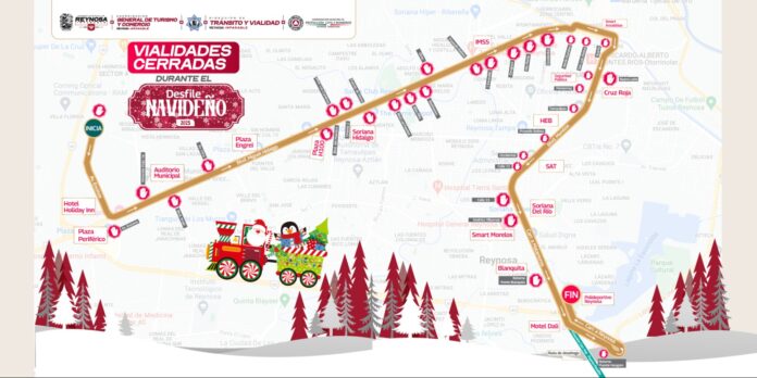Los autos arreglados con motivo navideño partirán a las 6:00 P. M. del circuito vial Periférico, entrada al parque industrial Villa Florida, para continuar por el bulevar Miguel Hidalgo y avenida Tiburcio Garza Zamora, continuando por el bulevar Morelos hasta finalizar en el Polideportivo.