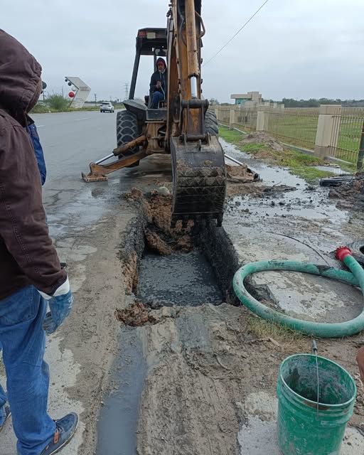 La Comisión Municipal de Agua Potable y Alcantarillado de Reynosa lleva a cabo la reparación de una fuga de agua residual proveniente del emisor del Cárcamo 14, sobre la Carretera Reynosa–Río Bravo, con el objetivo de atender de manera oportuna la situación y evitar mayores afectaciones en la zona.
