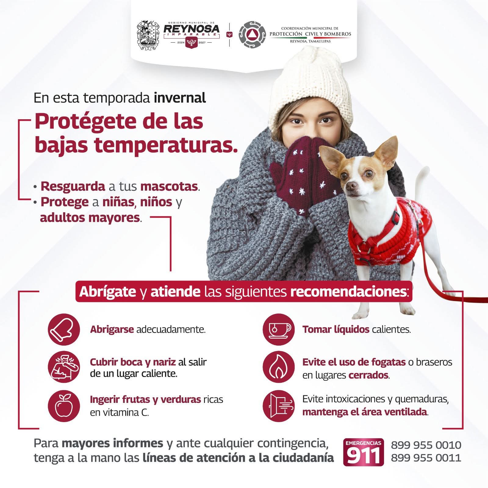 La Coordinación de Protección Civil y Bomberos, la Dirección de Salud y Grupos Vulnerables y la Dirección de Control y Bienestar Animal recomiendan protegerse de las bajas temperaturas, no exponer a niños, personas enfermas o con discapacidad, adultos mayores y mascotas al riesgo del frío y de cambios bruscos de temperatura.