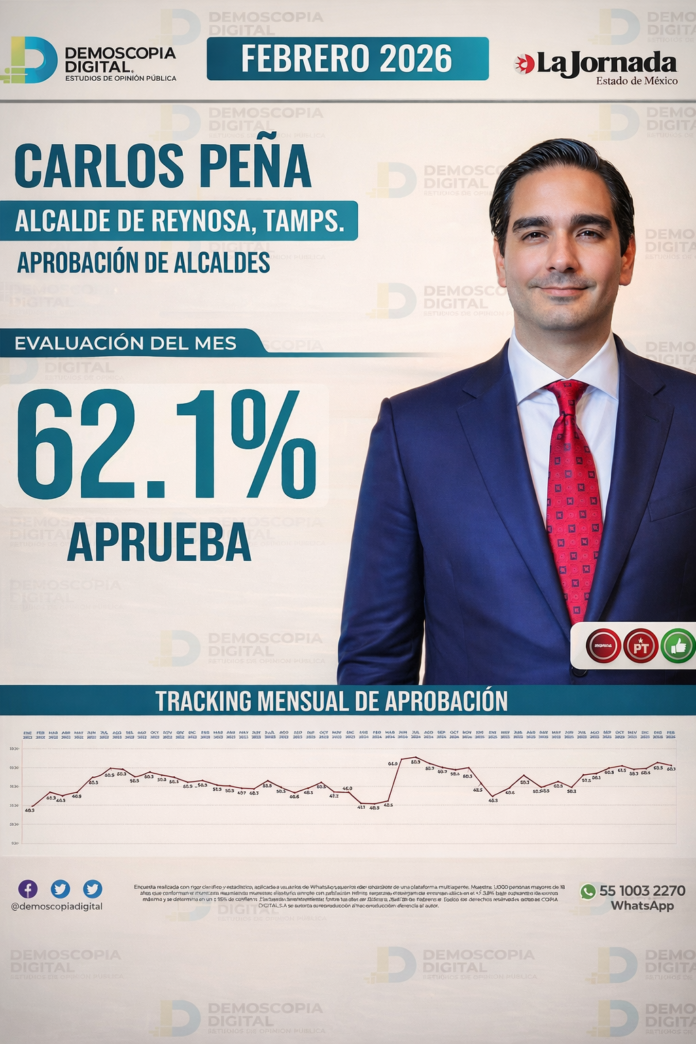El alcalde de Reynosa, Carlos Peña Ortiz, registra un nivel de aprobación del 62.1% entre la ciudadanía, de acuerdo con la más reciente medición de la casa encuestadora Demoscopia Digital, difundida en conjunto con el medio La Jornada Estado de México.