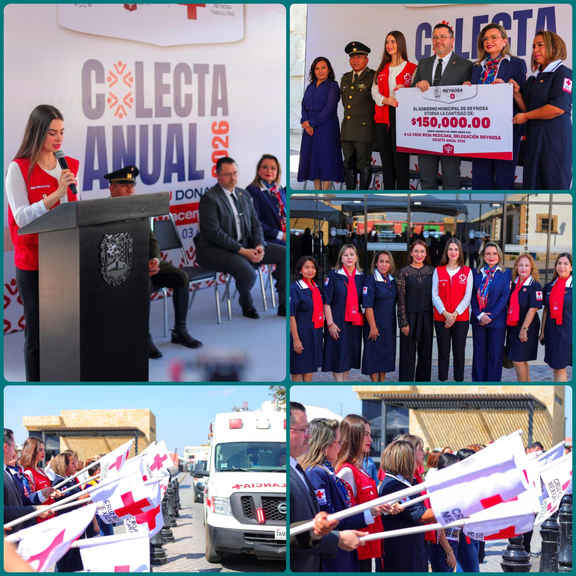 Durante el acto, el Gobierno de Reynosa, encabezado por el alcalde Carlos Peña Ortiz, entregó un donativo de 150 mil pesos destinado a respaldar las labores de atención médica, traslado en ambulancias y asistencia en emergencias que diariamente realiza la Cruz Roja en beneficio de la población. La entrega fue realizada por el secretario del Ayuntamiento, Antonio Joaquín de León Villarreal, en representación del presidente municipal.