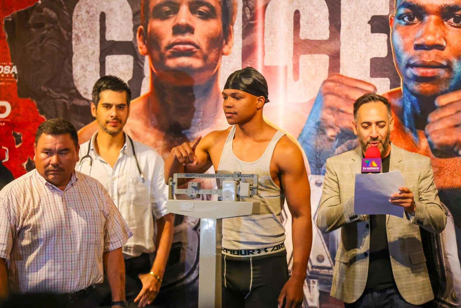 Cumpliendo con el reglamento que rige este deporte, pasaron a la báscula los protagonistas de la pelea semi estelar: Fernando Quiñones, de Los Mochis, Siinaloa y José Hernández, de Hermosillo, Sonora, así como