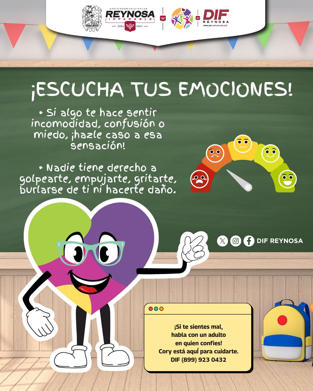 El Sistema DIF-Reynosa que preside Carlos Luis Peña Garza, hace un llamado a la ciudadanía a fomentar la comunicación y el cuidado emocional de niñas y niños, recordando a través de «Cory» la importancia de expresar lo que sienten y acudir a un adulto de confianza cuando algo no se encuentra bien.